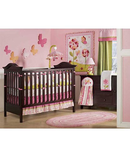 This cute crib set from Kids Line is a cheerful way to make your little one feel at home! It features floral and butterfly appliques with embroidered and printed accents. Includes: Quilt: 45" x 36" (65% Polyester, 35% Cotton; Fiber Fill; 100% Polyester) Fitted Sheet: 52" x 28" (100% Cotton) Dust Ruffle: 52" x 27.5", 14" drop (65% Polyester, 35% Cotton) 4-Piece Bumper: 156" x 10" (65% Polyester, 35% Cotton; Fiber Fill: 100% Polyester) Short Sides: 27" x 10" Long Sides: 51" x 11" Diaper Stacker: 25.5" x 12" x 9" (Pique: 100% Cotton; Print: 65% Polyester, 35% Cotton) Bodysuit: 3 - 6 Months (100% Cotton) Machine Wash Cold Made in China